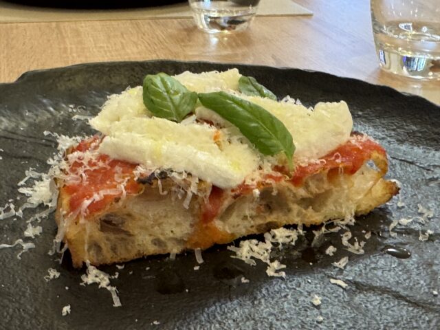 Due interpretazioni diverse di pizza, che rendono l’idea del filone che percorre Concetto Partenopeo. In carta anche Friarielli e Salsiccia versione pala (15 €) e Donna Carmela condita con pancia di maiale cotta bassa temperatura, patate al forno, gel di papaccelle, spuntoni di pecorino romano (18 €).