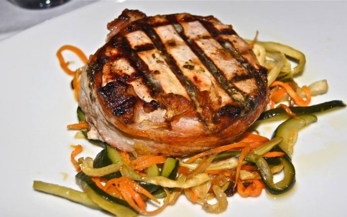 Ristorante Del Borgo, filetto di maiale alla brace con pancetta arrotolata e scaglie di cipolla accompagnato da misticanza di verdure