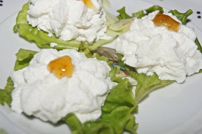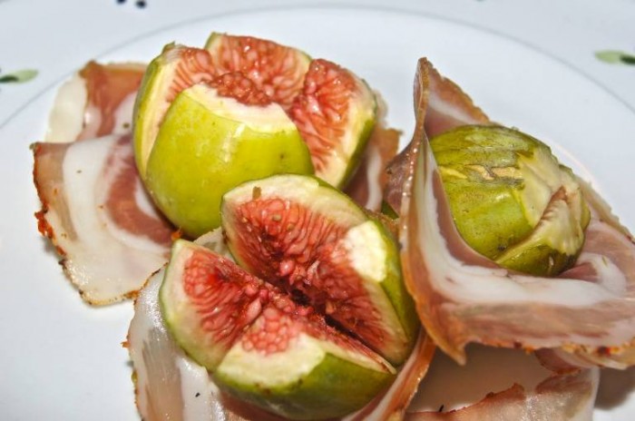 Gli antipasti: Pancetta paesana e fichi, Sformato di zucca, Millefoglie di melanzane con mozzarella di bufala campana dop, Zuppa del borgo, Pagnotta con minestra contadina, Fiore di ricotta di bufala con confettura di fichi.
