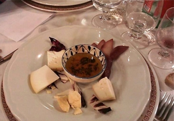 antipasto: formaggi “La Teresina” e miele “Le ghiandaie”, zuppa di fagioli, involtino di melanzana con provola affumicata e salsiccia essiccata nostrana.