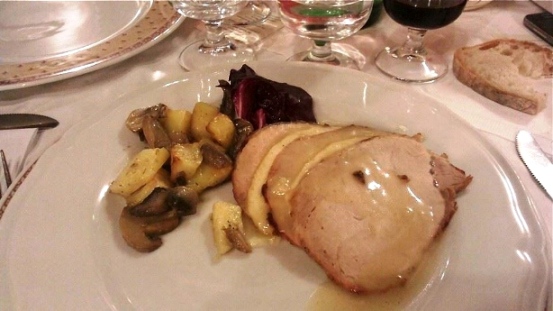 Un secondo piatto: millefoglie di maialino paesano e provola affumicata con patate e funghi champignon.