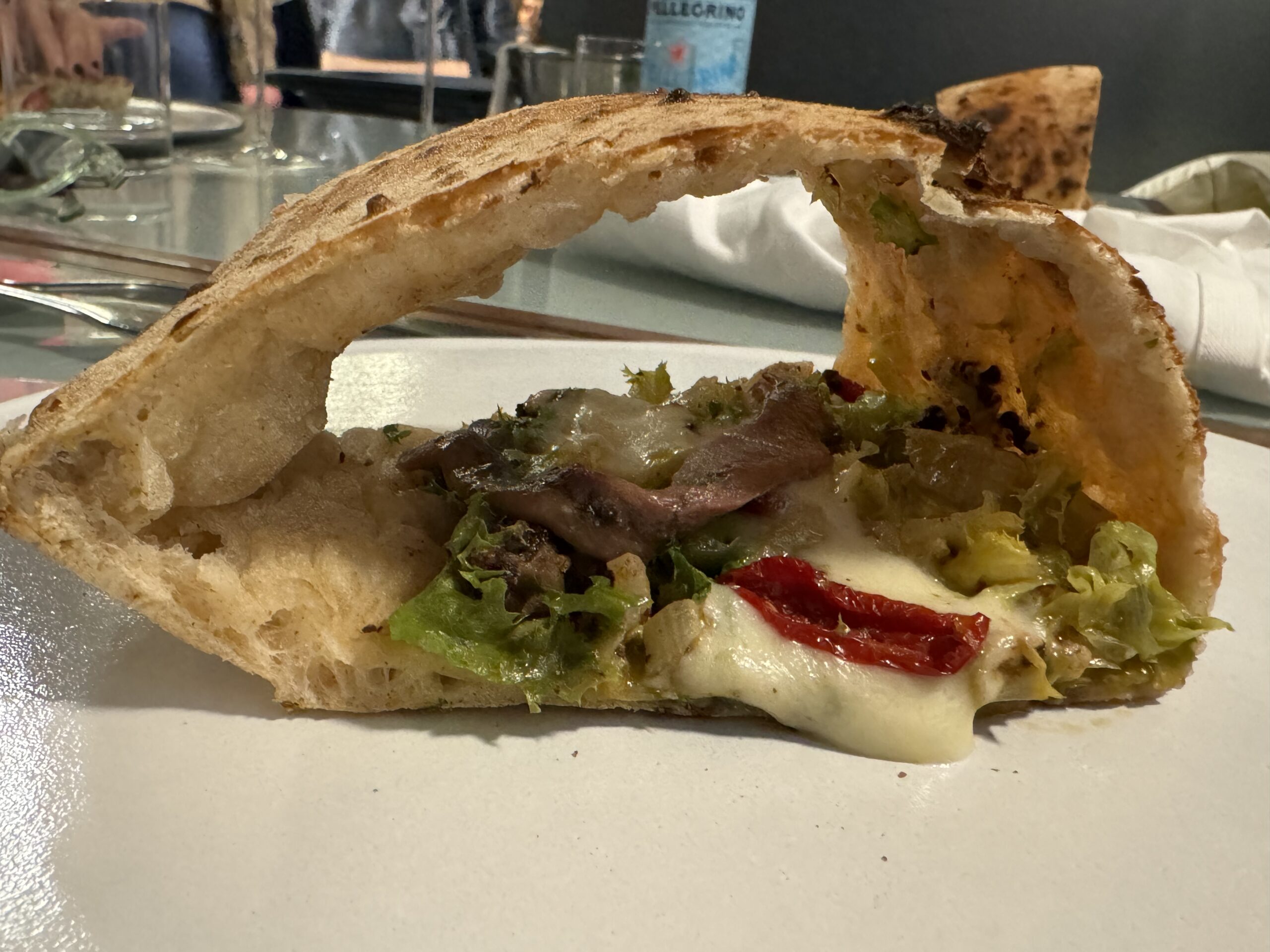 Calzone scarola Scarola con colatura e alici di Cetara, olio al peperoncino, noci Sorrentine, olive nere Caiazzane, capperi di Salina, pomodorini datterini, aglio orsino, provola affumicatajpg