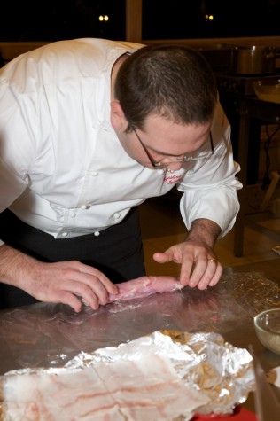 Ricetta scuola di cucina Mise en place. Coniglio di cortile in farcia di lardo d’Aurano con caponatina di verdure e gelato all’anice stellato e riduzione di Aglianico