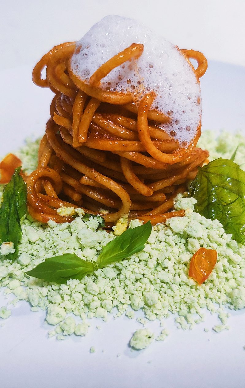 La preparazione gioca con consistenze e concentrazioni di sapori, tenendo sempre conto della semplicità degli ingredienti classici. La scelta del formato di pasta non poteva che ricadere sugli spaghetti, emblema della pasta al pomodoro della tradizione partenopea. Il basilico ha assunto una consistenza sabbiosa, attraverso l’utilizzo della maltodestrina e dell’olio al basilico. Il gusto del pomodoro è intensificato, tramite la tostatura e l’estrazione dei suoi succhi, così da stimolare il senso del gusto umami. Il parmigiano è stato trasformato in un’aria soffice e spumosa, che si dissolve in bocca.