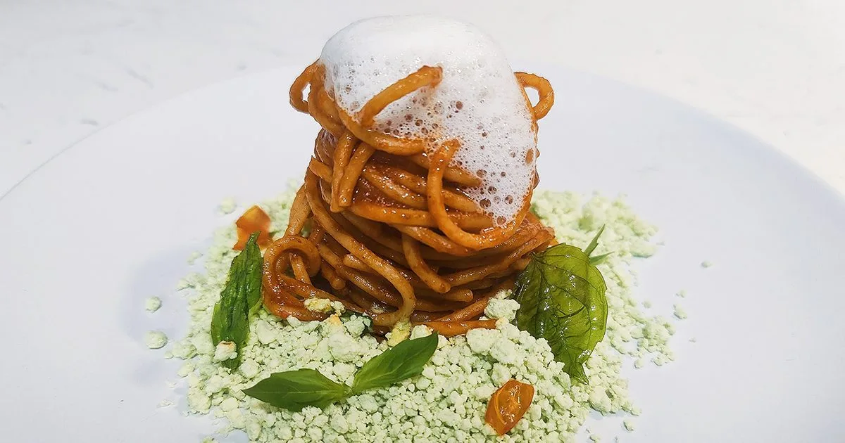 La preparazione gioca con consistenze e concentrazioni di sapori, tenendo sempre conto della semplicità degli ingredienti classici. La scelta del formato di pasta non poteva che ricadere sugli spaghetti, emblema della pasta al pomodoro della tradizione partenopea. Il basilico ha assunto una consistenza sabbiosa, attraverso l’utilizzo della maltodestrina e dell’olio al basilico. Il gusto del pomodoro è intensificato, tramite la tostatura e l’estrazione dei suoi succhi, così da stimolare il senso del gusto umami. Il parmigiano è stato trasformato in un’aria soffice e spumosa, che si dissolve in bocca.