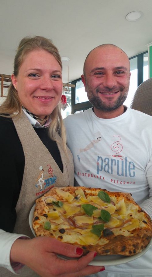 Last but not least la sommelier Adele Elisabetta Granieri che ha voluto trasportare uno dei suoi piatti preferiti, la amatriciana rossa, sulla pizza utilizzando pomodoro san marzano, cipolla ramata di Montoro, guanciale, pecorino romano e un ottimo olio extravergine di oliva del Vesuvio Villa Dora. Anche in questo caso il risultato è stato molto apprezzato, la pizza è finita in fretta e, da brava sommelier, Adele ha personalmente stappato e servito il Piedirosso dei Campi Flegrei 2014 di Agnanum, vino cult ormai a Le Parùle.