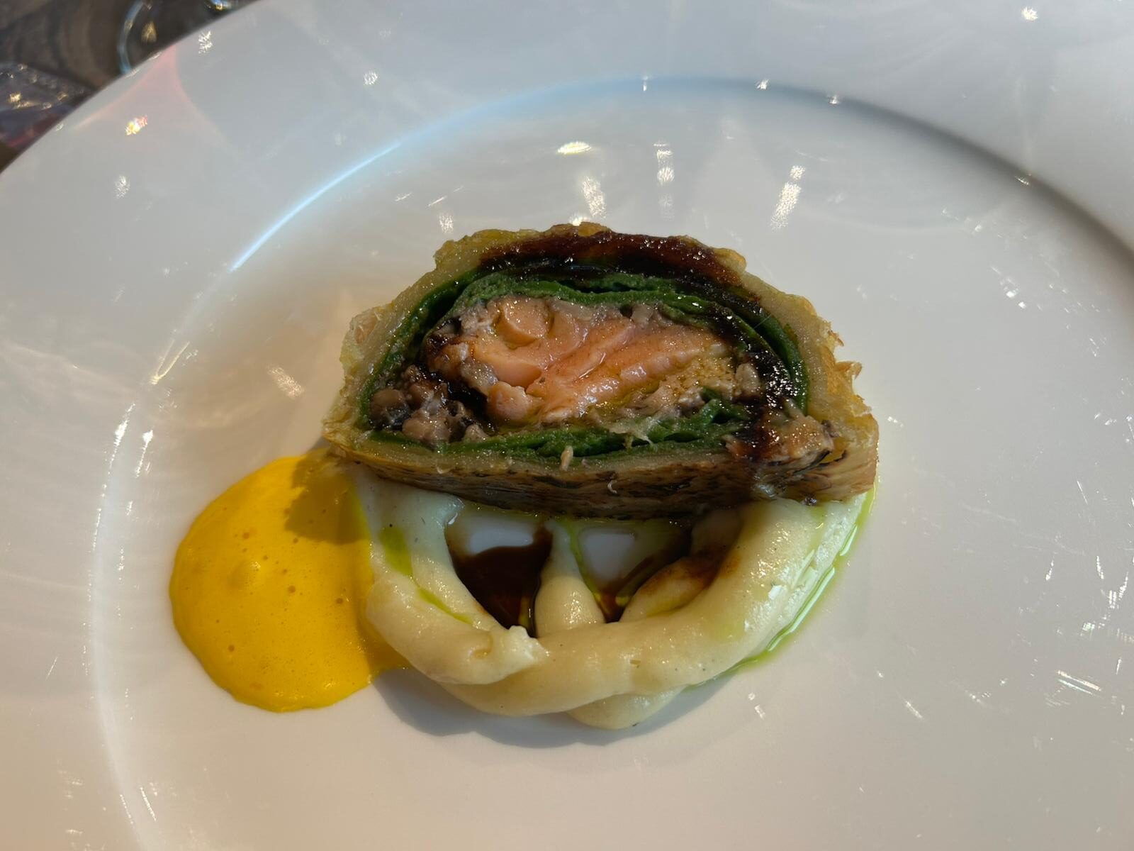 Salmone alla Wellington, salsa bernese allo zafferano e patata mantecata. In abbinamento Sommitale rosso.