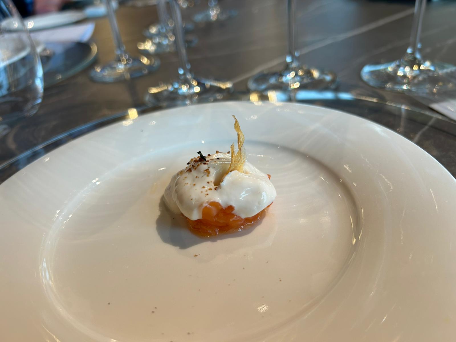 Tartare di salmone, spuma di kefir e patata vetrificata, l’entrée di benvenuto. In abbinamento Classe 39 bianco