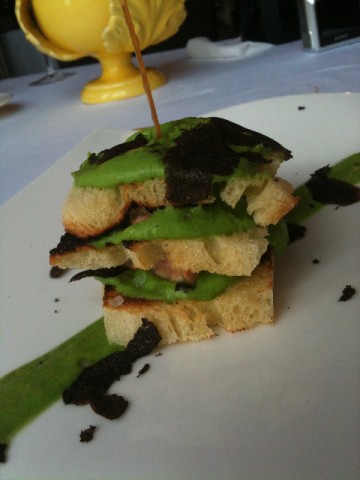 CLUB SANDWICH DI PANE DI ALTAMURA, FOIE-GRAS, TARTUFO NERO E CREMA DI RAPE