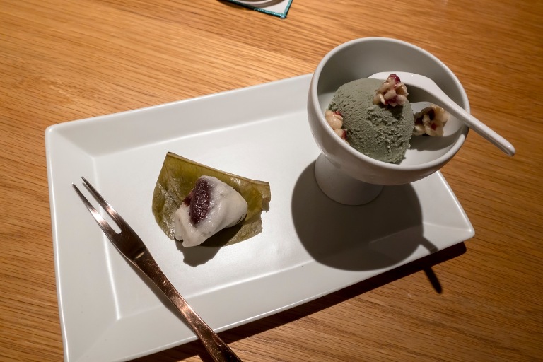 Gelato al tè verde e dolce al fagiolo rosso. Ottimo dessert, leggero, fresco e soddisfacente.