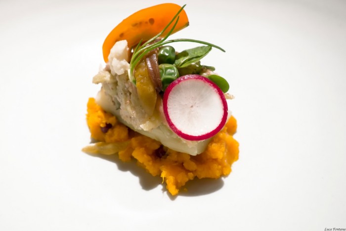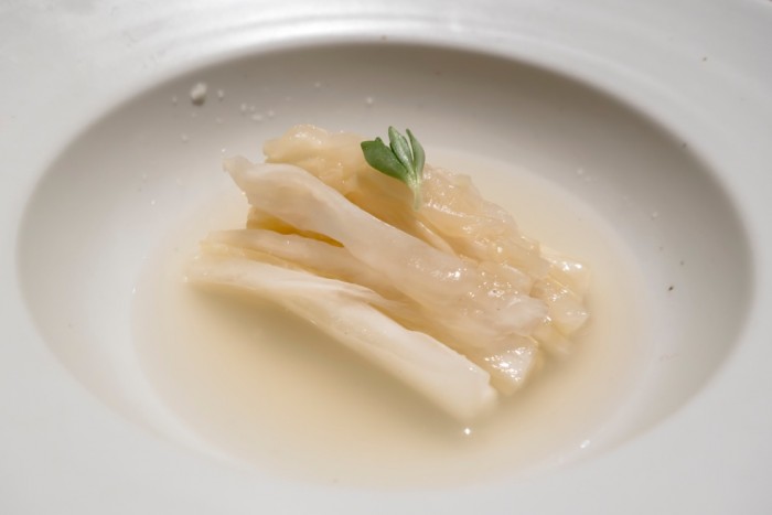 Cavolo lievemente fermentato. Un ulteriore passaggio fresco, che approfondisce il concetto di fermentazione. La preparazione di base è quella del Kimchi, ma qui lo troviamo senza spezie. Interessante poterne gustare il sapore e la consistenza senza distrazioni piccanti. Al palato è qualcosa di molto particolare, bisogna decisamente farci l’abitudine, ma, assaggio dopo assaggio, il sapore diventa gradualmente piacevole, con una leggera nota acida che si contrappone al “profumo” poco invitante, almeno per il nostro naso non ancora abituato a questi sapori.