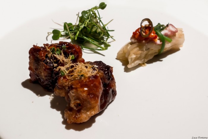 Maiale caramellato e cavolo fermentato. Il maiale è dolce e croccante, con l’interno morbidissimo. Il cavolo è il nostro primo passo nell’immenso mondo delle fermentazioni Koreane. Bellissimo passaggio, dolce, grasso, sapido e, molto, soddisfacente.