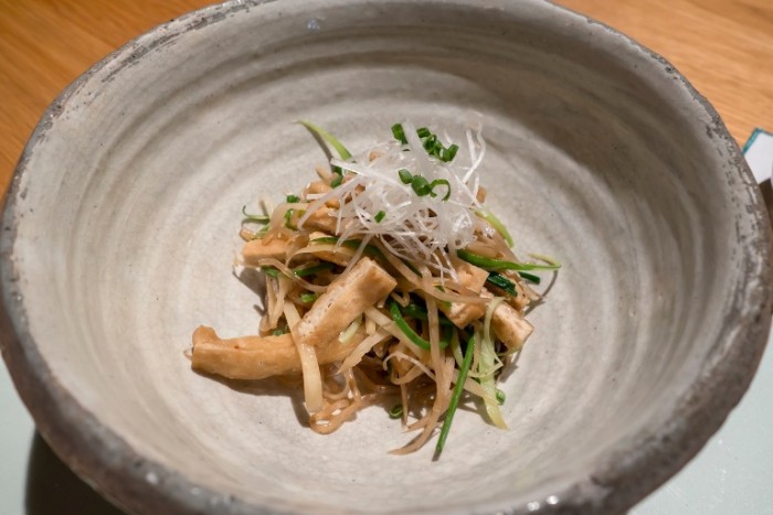 Dubu Jabchae: radici di campanula e tofu Koreano. Altro passaggio molto fresco e delicato, utile per resettare il palato dalla portata precedente.