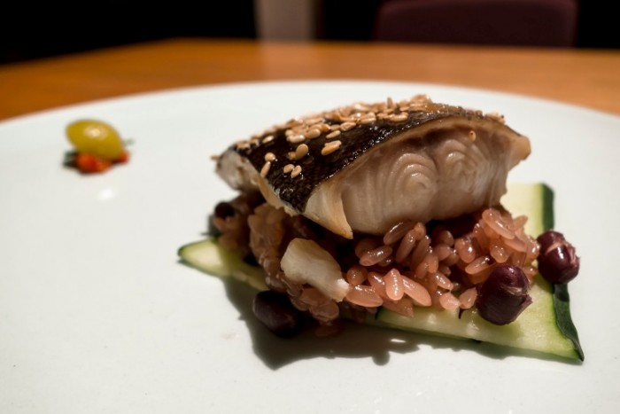 Eun-Dae-Gu Gui, merluzzo grigliato con riso ai fagioli rossi. Il riso, tradizionalmente molto colloso, viene sapientemente mischiato al legume. Il merluzzo è di grande qualità e di preparazione puntuale, con un delicato sapore di griglia. Ottimo!