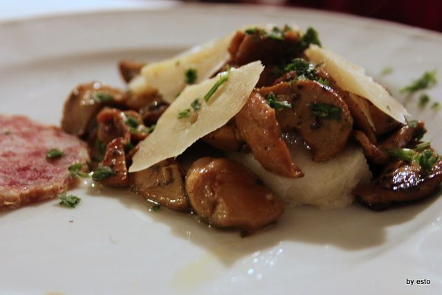 Poi la polenta di mais bianco con i porcini, il salame grasso e il parmigiano.
