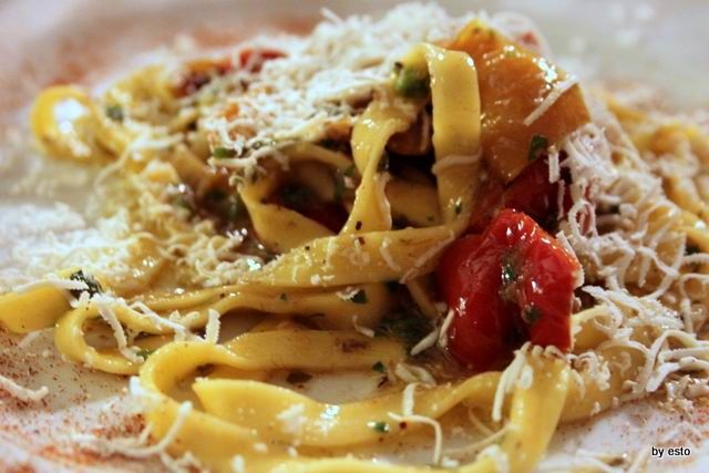 Un bel primo colorato giallo e rosso di tagliatelle fatte in casa con i peperoni saltati in padella in olio evo e ricotta di capra.