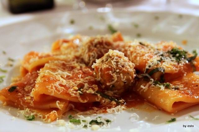 Paccheri di Gragnano con ragù e polpette. C’è grattugiata la ricotta secca salata.