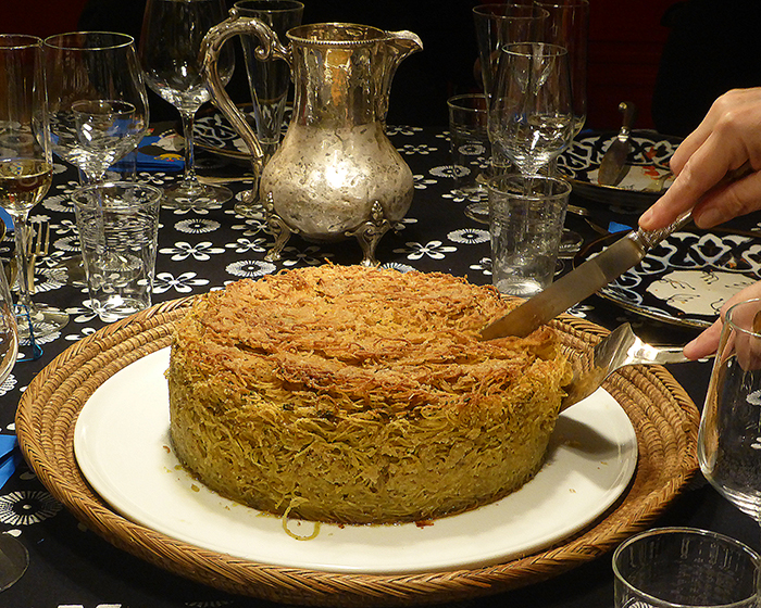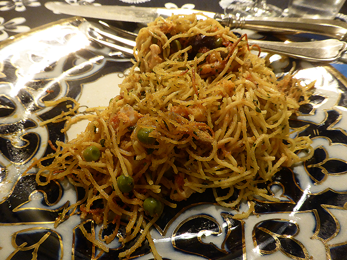 Non poteva esimersi dal regalarci la sua ricetta Jeanne Carola Francesconi che ce lo presenta sotto forma di timpano arricchito, però da cozze, gamberetti, funghi, piselli che sebbene ingredienti di magro ne snaturano troppo la caratteristica di piatto povero.