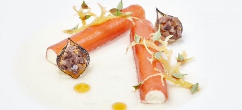 Centrifugare il datterino giallo in acqua di mare avendo cura di mettere da parte il liquido di governo dei pomodori e filtrare. Cuocere gli spaghetti in acqua di pomodoro e acqua di mare, frullare a velocità 10 per circa 1 minuto. Con l’aiuto di uno stampino a forma di radice spalmare il composto su un silpat e cuocere in forno a 80° C per circa 1 ora.