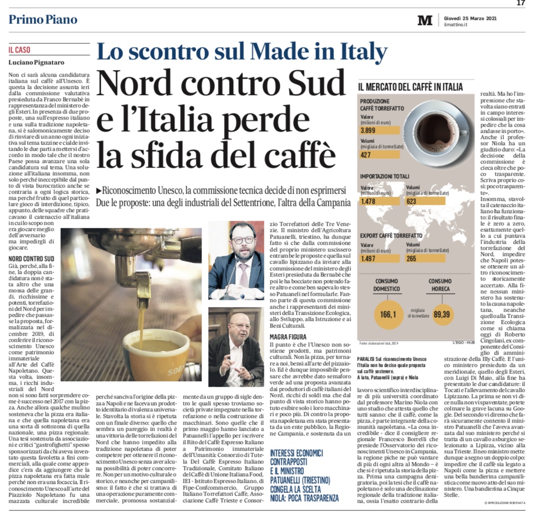 Stavolta la storia si è ripetuta con un finale diverso: quello che sembra un pareggio in realtà è una vittoria delle torrefazioni del Nord che hanno impedito alla tradizione napoletana di poter competere per ottenere il riconoscimento Unesco senza aver alcuna possibilità di poter concorrere. Non per un motivo culturale o storico, e neanche per campanilismo: il fatto è che si trattava di una operazione puramente commerciale, promossa sostanzialmente da un gruppo di sigle dentro le quali spesso troviamo società private impegnate nella torrefazione o nella costruzione di macchinari. Sono quelle che il primo marzo hanno lanciato a Patuanelli l’appello per iscrivere il Rito del Caffè Espresso Italiano a Patrimonio immateriale dell’Umanità: Consorzio di Tutela Del Caffè Espresso Italiano Tradizionale, Comitato Italiano del Caffè di Unione Italiana Food, IEI – Istituto Espresso Italiano, di Fipe-Confcommercio, Gruppo Italiano Torrefattori Caffè, Associazione Caffè Trieste e Consorzio Torrefattori delle Tre Venezie. Il ministro dell’Agricoltura Patuanelli, triestino, ha dunque fatto si che dalla commissione del proprio ministero uscissero entrambe le proposte e quella sul cavallo lipizzano da inviare alla commissione del ministero degli Esteri presieduta da Bernabè che poi le ha bocciate non potendo fare altro e come ben sapeva lo stesso Patuanelli nel formularle. Fanno parte di questa commissione anche i rappresentanti dei ministeri della Transizione Ecologica, allo Sviluppo, alla Istruzione e ai Beni Culturali.