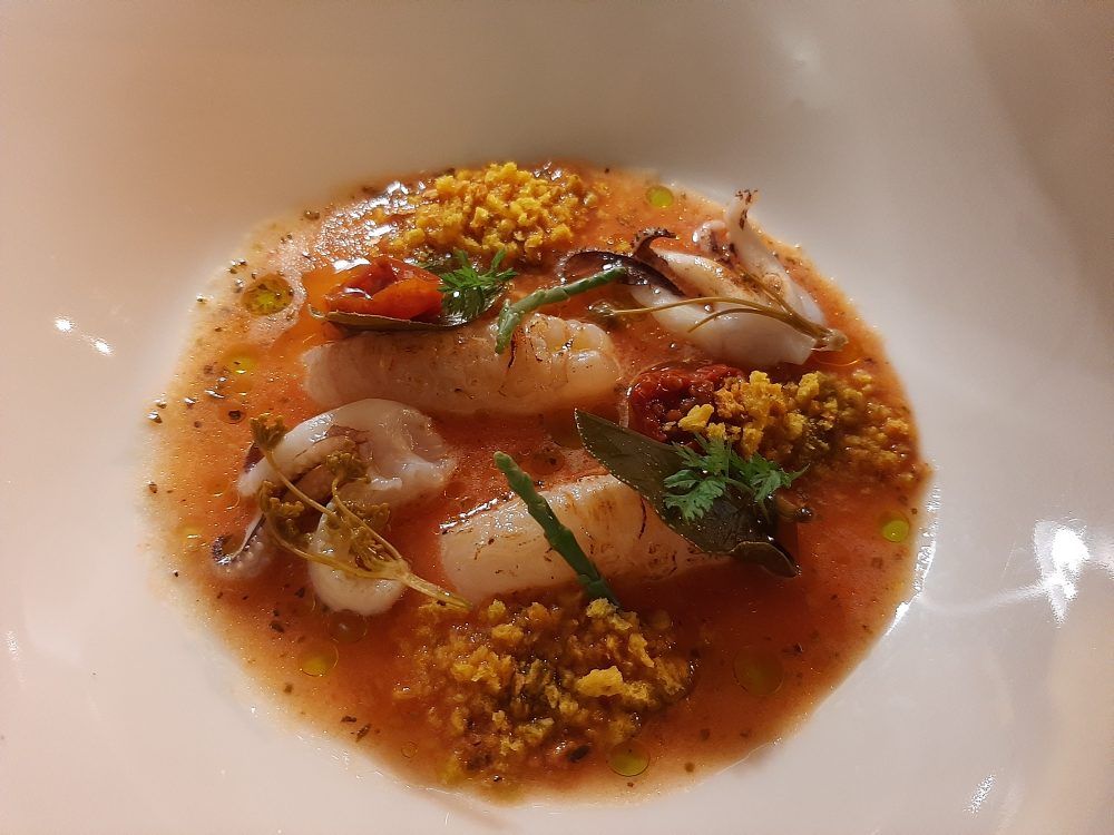 Come antipasto scampi, seppia, riddhiri (semi di pomodoro) con salicornia, foglia di cappero, crumble di frisella e pomodorino semisecco. Un buon piatto, acido e piacevole che strizza l’occhio alla tradizionale cucina pugliese di terra e di mare ed anche qualcosa di più.