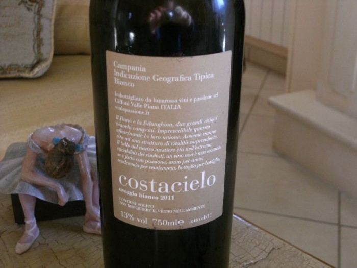 Beh devo affermare, con mio sommo stupore, che mi sono trovato in presenza di due vini diversi, pur tenendo conto delle due annate differenti e comunque sono entrambi godibili. Il Costacielo 2011, già esplorato nel mese di giugno scorso, è fruttatamente polposo di pesca bianca e di mela, con sottofondo di gelsomino e di nocciola. E’ sapido, erbaceo, fresco, agrumatamente pervasivo e fragrante e con una chiusura bene articolata ed elastica.