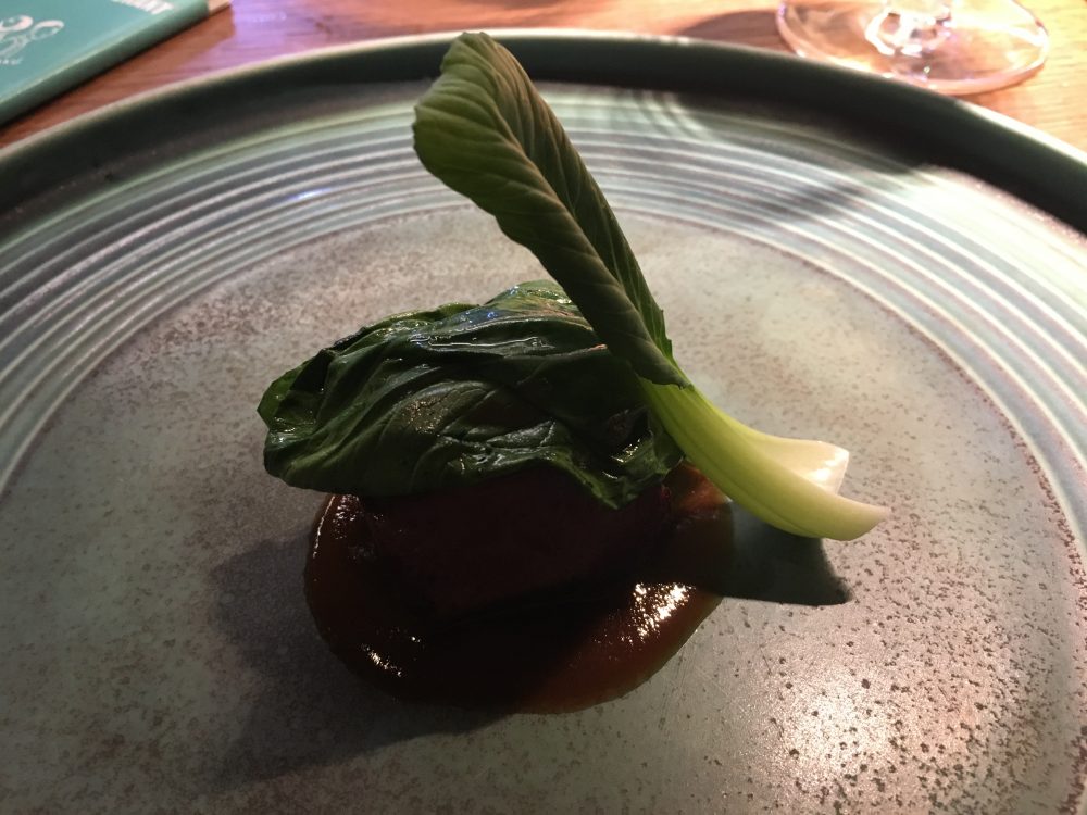 Hanno lavorato sulle teste, allora, per ricreare la salsa che è sul fondo del piatto e che accoglie nel suo ventre gustoso l’insalata fatta con le code, con la scorza d’arancia, sale e pepe e le codine fritte; dalla valigia della Sicilia anche il pistacchio leggermente tostato che, a occhi chiusi, catapulta nei vicoli dei paesini isolani dove in ogni casa c’è un braciere che brucia.