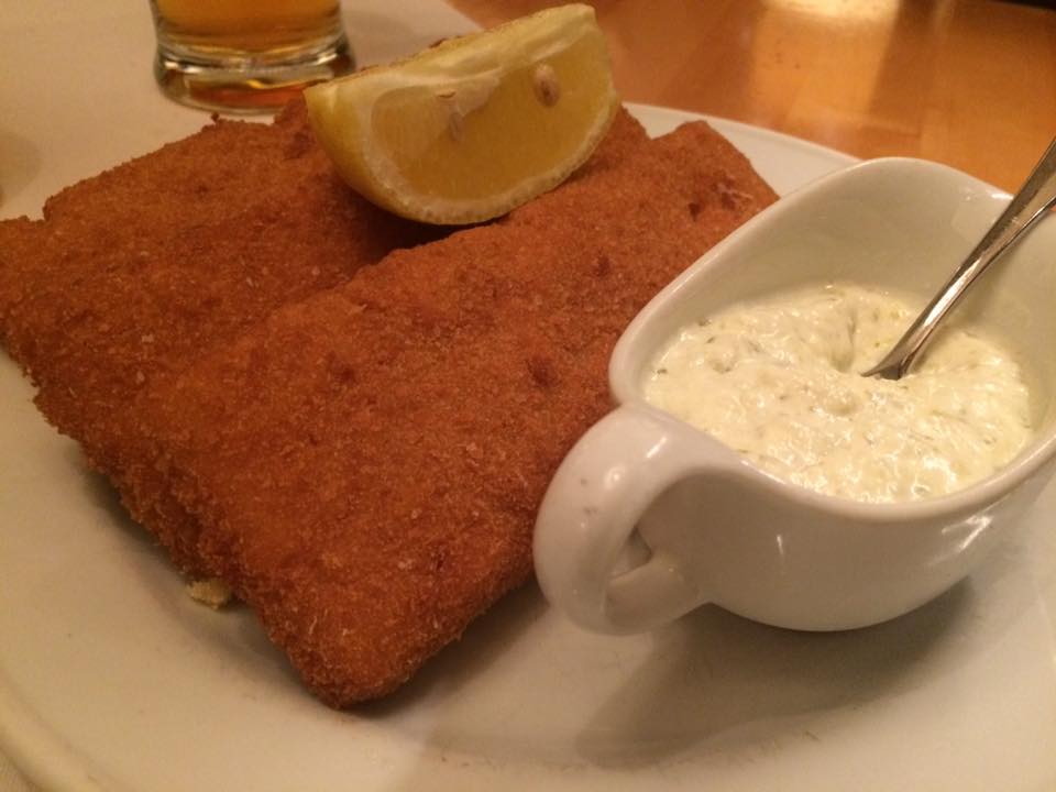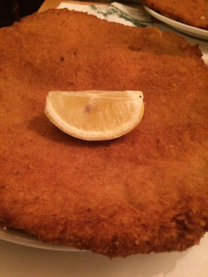 E veniamo ai piatti. Entrambe le versioni sono gustose, fritte davvero bene, con una panatura che accompagna simbioticamente la carne fino all’ultimo boccone: così come deve essere. Quella di vitello, cioè la classica Wiener Schnitzel (in carta a 19,80 euro) è solo leggermente più tenace di quella di maiale, ma entrambe sono molto tenere ed enormi: vanno infatti ben oltre il bordo del piatto!