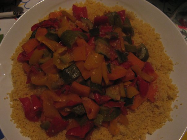 Preparate un brodo vegetale con una cipolla, 2 carote ed una costa di sedano. In un grosso tegame fate appena soffriggere la ½ cipolla con dell’olio extravergine d’oliva, aggiungervi i pomodori tagliati a pezzettoni, dopo 5 ‘ versare nel tegame peperoni, zucchine e carote tagliati a pezzi grossi ed il peperoncino, far rosolare per 5′ il tutto e versarvi un mestolo di brodo vegetale e continuare la cottura per circa un’ora coprendo il tegame con un coperchio e aggiungendo volta per volta del brodo vegetale in modo che le verdure rimangano ben umide e salarle leggermente. Cuocere il cous cous con del brodo vegetale salato in precedenza, versarlo su un grosso piatto da portata, spolverarlo leggermente con della cannella in polvere e mescolare, adagiare sul cous cous le verdure stufate, grattugiare sul tutto la scorza di un limone ben fresco e non trattato facendo ben attenzione a grattugiare solo la parte gialla e mai quella bianca che risulta amara, versare sul tutto un filo d’olio extravergine d’oliva.