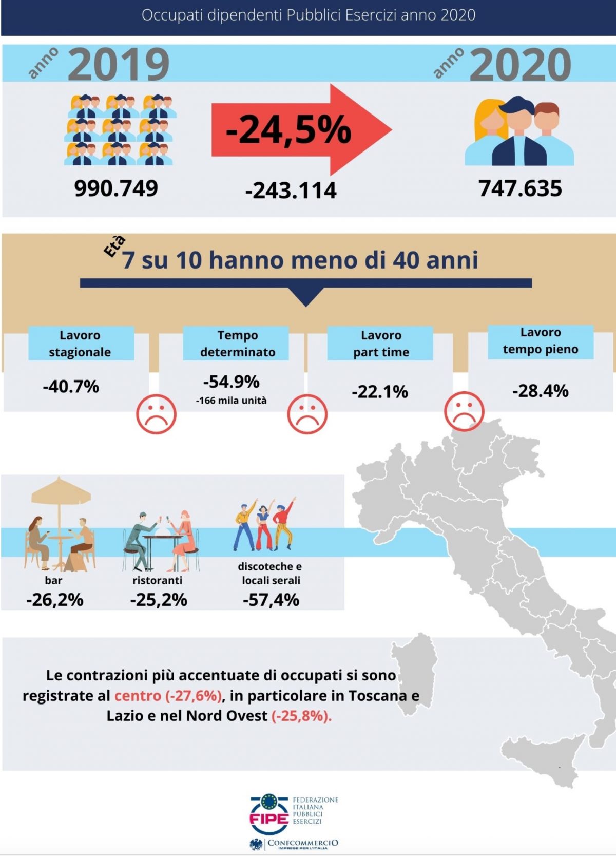 L’ufficio studi di Fipe-Confcommercio, la Federazione Italiana dei Pubblici esercizi, ha infatti raccolto ed elaborato i dati INPS relativi ai livelli occupazionali del 2020: bar, ristoranti, discoteche e imprese di catering e banqueting hanno perso 243mila occupati rispetto al 2019, quando sfioravano il milione. A sparire sono stati principalmente cuochi, camerieri, barman e tra questi anche poco meno di 20 mila apprendisti. Proprio i giovani pagano il conto più salato di questa crisi: 7 su 10 di coloro che hanno perso il lavoro hanno meno di 40 anni.