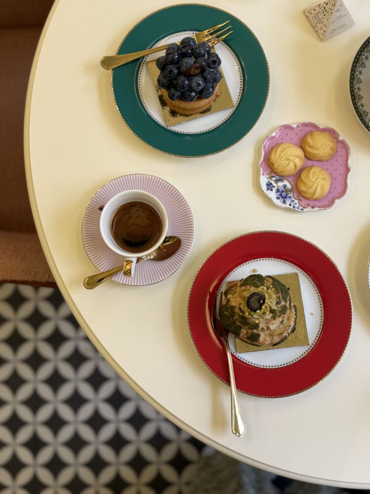 E se il gusto è poesia, lo è anche lo sguardo: le ceramiche Pip Studio, arrivate dall’Olanda, dialogano con le pareti verdi, con i pavimenti optical e i dettagli dorati. Ogni tazzina, ogni piatto, è una piccola opera d’arte, scelta con cura maniacale. Lo splendore di un tè servito in queste porcellane non è solo estetica: è un invito a rallentare, a fermarsi, a vivere.