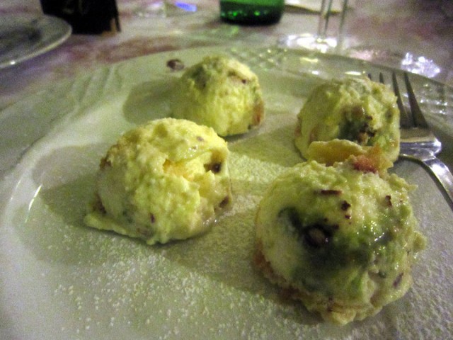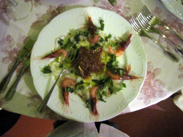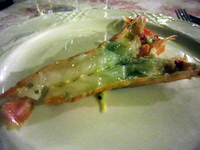 Tra i crudi, compare un poco convinto “Salmone ammudicatu con prosciutto di tonno”, il piatto è un po’ debole, lo stesso Ercole riconosce che non c’entra nulla con i piatti precedenti. Facciamo un balzo in avanti, arriva un purissimo crudo di scampi appena pescati, abbiamo abbinato come per i piatti precedenti un piacevolissimo greco calabrese frizzante, scorrevole con una buona sapidità e persistenza. Diamo uno sguardo alla carta dei vini per un eventuale cambio, rimaniamo un po’ delusi, vista la vivacità e curiosità in cucina ci aspettavamo qualcosa di simile anche per la carta dei vini che ci sembra un po’ scontata probabilmente per mancanza di tempo:)