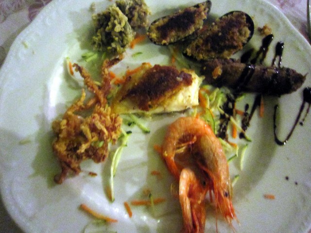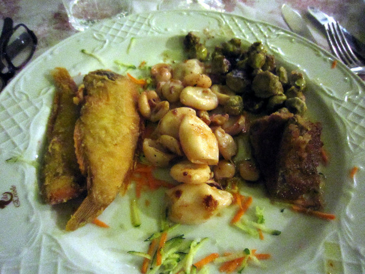 il misto di secondi: “sorici” fritti, seppioline, tonno scottato e fantastici carciofini selvatici dell’orto di Capo Colonna