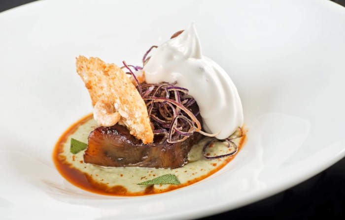 Per la crema di melanzane, pelare una melanzana (tenere da parte la buccia per la guarnizione) tagliarla a cubetti e rosolarla in una padella con olio extra vergine di oliva e uno spicchio di aglio,continuare la cottura a fiamma bassa con coperchio fino a quando la melanzana non si sfalda. Terminata la cottura con l’ausilio di un mix ad immersione, frullare fino ad ottenere una crema liscia e omogenea; regolare di sale e tenere da parte.