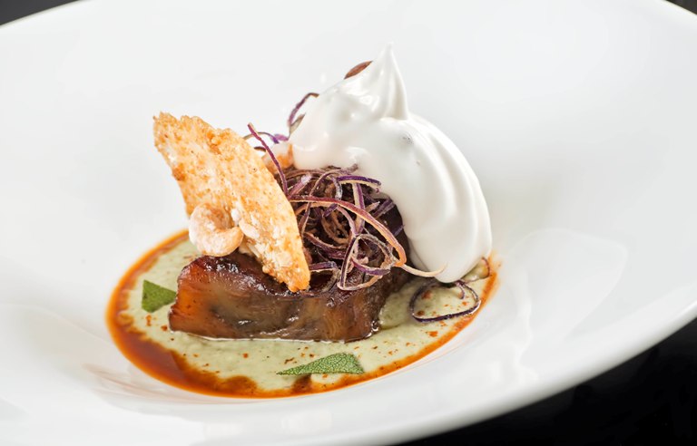Riscaldare la crema e la salsa. Alla base di un piatto fondo mettere un cucchiaio di crema di melanzana, adagiarvi il cubo e nappare leggermente con la salsa le estremità della crema di melanzana. Sopra il cubo di melanzana appoggiare le bucce fritte, la cialda e, su di un lato, far cadere un po’ di spuma di birra.