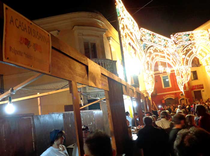 All’arrivo ho il dubbio di essere entrato dalla parte sbagliata, regna infatti un inaspettato silenzio e nella tranquilla notte di fine estate solo l’improbabile fila di auto parcheggiate tiene viva la speranza di ritrovarmi, a breve, tra luminarie, schiamazzi, musica e profumi di festa.