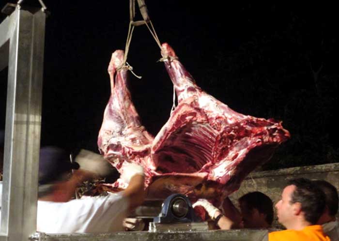 “Silenti”, i due vitelli, “aspettano” d’essere posati sui ferri restano ancora celati alla vista e protetti dalla temperatura nella loro cella frigorifera in attesa della gru per il sollevamento verso lo spiedo; due animali, a detta degli esperti presenti, di circa 4 quintali (ante fuoco) che perderanno gran parte del loro peso durante la permanenza sulle braci (circa 14 ore).
