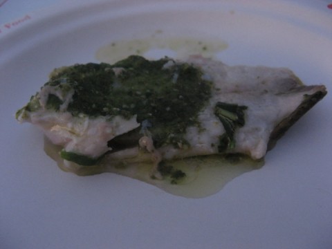 Dopo circa trenta minuti le pietanze cotte dal vapore delle fumarole sono pronte e vengono impiattate, accompagnate dai vini dell’azienda locale La Sibilla, Falanghina dei Campi Flegrei 2009 e Cruna del Lago 2008. La cottura è buona, ottimi i piatti di Tommaso e Gena, ma sopratutto molto valida l’iniziativa e profondamente suggestivo il poter cenare all’interno di un vulcano, al buio, godendo del tenue bagliore della luna riflesso dal forte candore del suolo bianco della solfatara colorato qua e là da pennellate di giallo, ocra ed arancione.