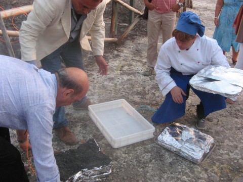 Pertanto hanno cucinato una millefoglie di alici con scarole e provola, poi un filetto di cefalo con pesto di basilico e pinoli. Intorno alle ore 19 la teglia con le pietanze è stata interrata nei pressi della Bocca Grande, la principale fumarola della Solfatara, dalla quale provengono emissioni di vapore che raggiungono la temperatura di 160°C.