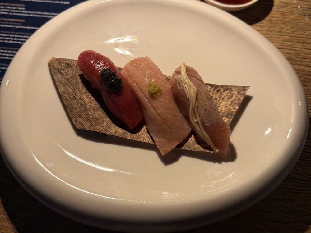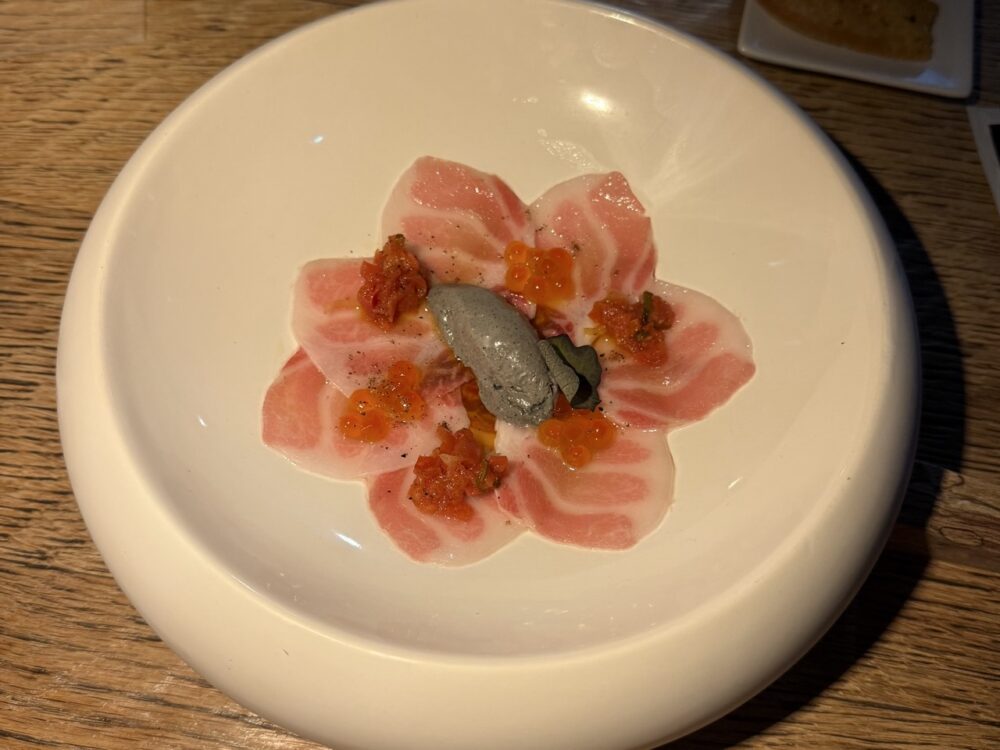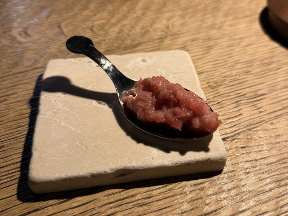 Un primo assaggio rituale: il nakaochi, raschiato direttamente dalla lisca, restituisce un gusto intenso ed essenziale. Poi il percorso si articola: una foglia di shiso in tempura accoglie una tartare grassa e avvolgente; il sunazuri, preparato in un carpaccio sottile, trova equilibrio con un gelato al sesamo; la tartare di chutoro invece, servita con un brodo dashi freddo, caviale di agrumi e wasabi kizami, è il piatto che più mi ha sorpreso, per la sua capacità di restituire perfettamente ogni sfumatura del tonno, perfettamente esaltata dal misto di sapori agrumati e umami.