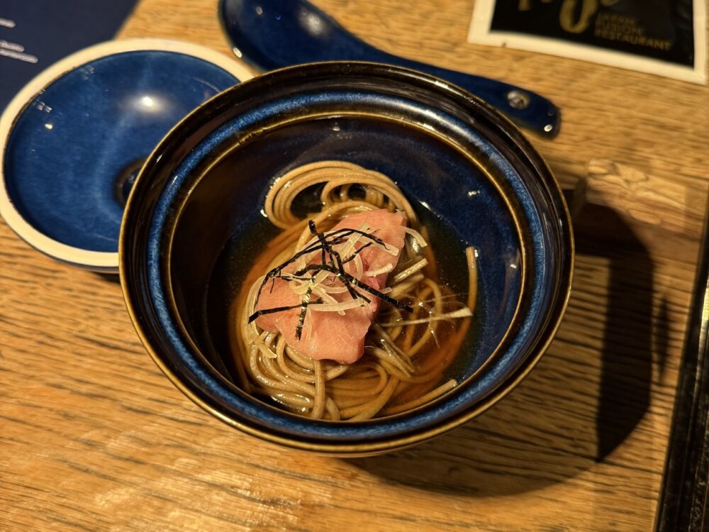 Prima di passare alle ultime due portate d’autore dello chef, si conclude il percorso con i carboidrati: zaru soba, tagliolini di grano saraceno serviti freddi con salsa tsuyu, cipollotto, alga nori e sashimi di chutoro. Un piatto eccellente, dal sapore completo: dal tagliolino di grano saraceno al sashimi, che apporta una piacevole componente grassa, fino allo straordinario brodo dashi, che avvolge il piatto e lo completa valorizzando ogni elemento con la sua essenza umami.