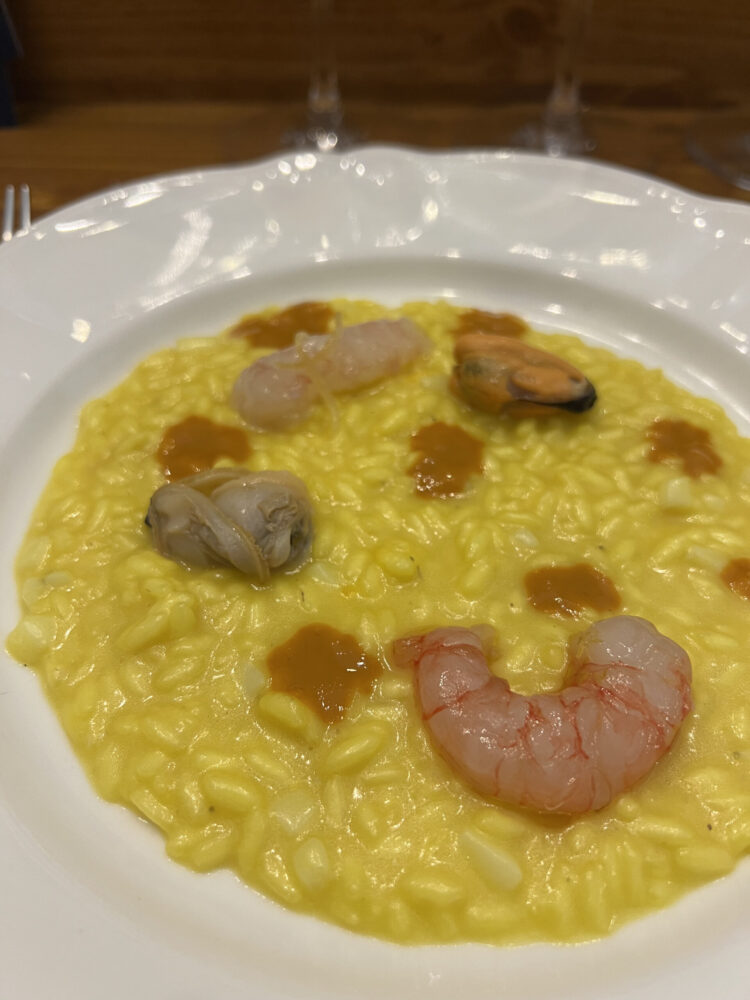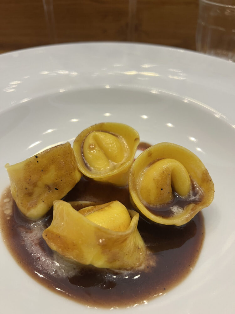 Due proposte all’insegna dell’armonia, che – per l’occasione – sono state accompagnate dal metodo classico rosato “Etna Est!” della cantina La Contea. In abbinamento avrebbe potuto esser accostato anche un rosato fermo, di media struttura. I primi hanno preso invece due direzioni opposte. Chef Casu ha optato per un risotto allo zafferano con frutti di mare e zest di limone, mentre chef Raciti ha presentato il suo tortello “40 tuorli” al parmigiano, con amarena e tartufo. Da un lato una preparazione cremosa, dove l’agrume talvolta sovrastava persino lo zafferano; dall’altro, una pasta ripiena dalla grande masticabilità.