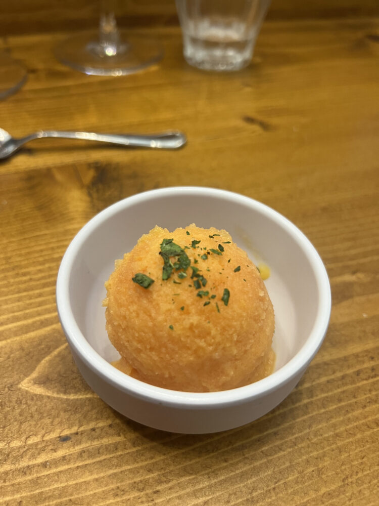 Per il pre-dessert, chef Mario Casu ha scelto di valorizzare l’arancia Tarocco, servita sotto forma di sorbetto e arricchita con basilico fresco: un boccone diretto e rinfrescante, perfetto per ripulire il palato e prepararlo al gran finale, il “Total White” di chef Giuseppe Raciti. Si tratta di un dolce composto da pan di Spagna al cocco, gelato “bianco” al caffè, spuma di cacao (anch’essa bianca) a coprire, e infine delle meringhe, che hanno conferito verticalità all’impiattamento. Un dessert che, all’apparenza, potrebbe sembrare azzardato e sbilanciato sulla dolcezza, ma che, al contrario, chiama l’ospite ad affondare una cucchiaiata dopo l’altra. L’elemento chiave dell’equilibrio di questa portata è stato sicuramente il gelato.