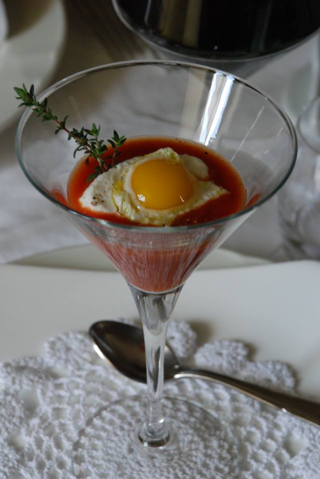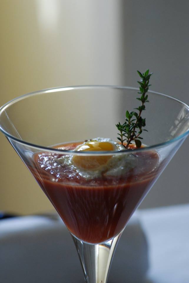 Infine in un piatto fondo mettere la vellutata di pomodoro calda e aggiungere una chenella di ricotta le uova e un filo d’olio.