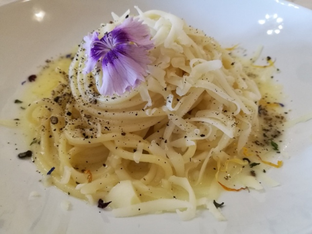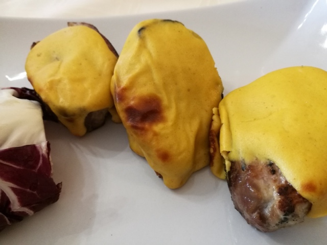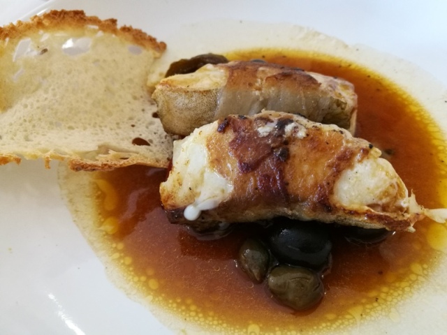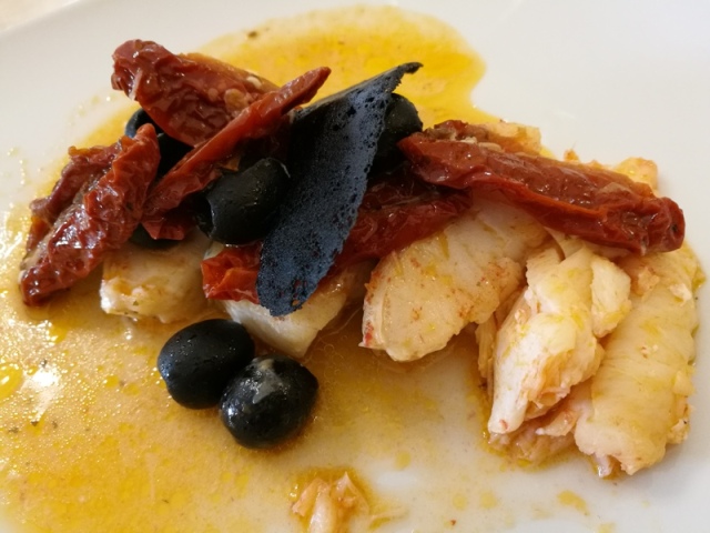 Stuzzicante (ma “degustato” solo con gli occhi) il risotto zafferano e liquirizia. In carta due piatti di pesce: Spaghettone alla carbonara di mare e Trofiette con crema di zucca e gamberi. Per il secondo di carne ecco la proposta del Filettino di maiale in crosta di senape: inutile specificare che la senape qui rappresenta il vero punto di forza, con il piatto che paga solo il leggero scotto della scelta del taglio più magro del maiale, perdendo in succulenza. E poi il trionfo del baccalà, degustato sia nella versione Lardiato su zuppetta di peperoni (molto, ma molto interessante) che nella più classica, Scottato con pomodori secchi e olive. Da aggiungere che al baccalà è dedicato un intero percorso: all’insalata con dadolata di patate e sedano; i già citati Mezzi paccheri e Baccalà scottato; Baccalà fritto su letto di misticanze.