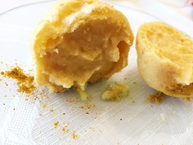 Ma l’amore tra lo chef e la terra titernina è già scoppiato. Lo mostra chiaramente la carta delle proposte che, pur manifestando il bagaglio di formazione acquisito negli 8 anni vissuto nei pressi di Düsseldorf, affonda le radici nella povera dispensa delle cucine di montagna. Contaminazioni in mostra fin dalla partenza, affidata ad un delizioso bignè farcito con crema di patate di Calvarusio (località cusanese che sorge ad oltre mille metri), con l’incursione di una spolverata di curry che dona al piccolo morso un profilo quasi orientaleggiante.