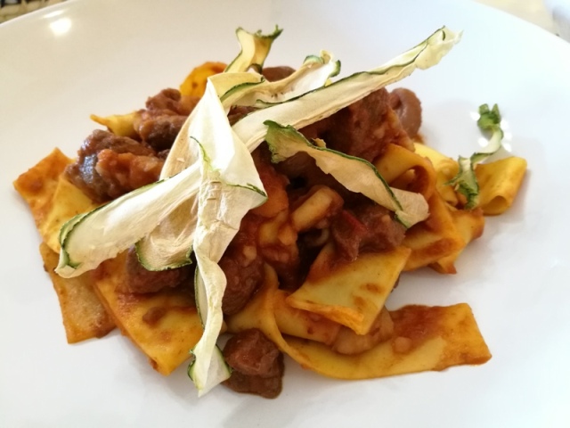 Il Convento – Mezzo pacchero all’amatriciana con baccalà con zest di peperoncino
