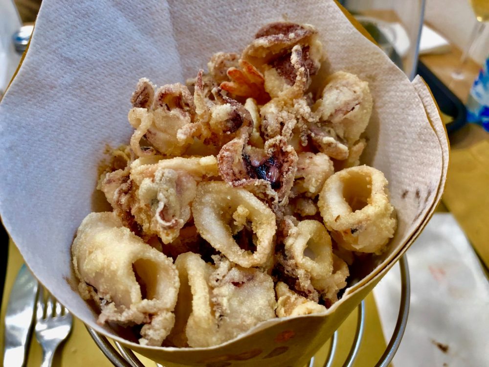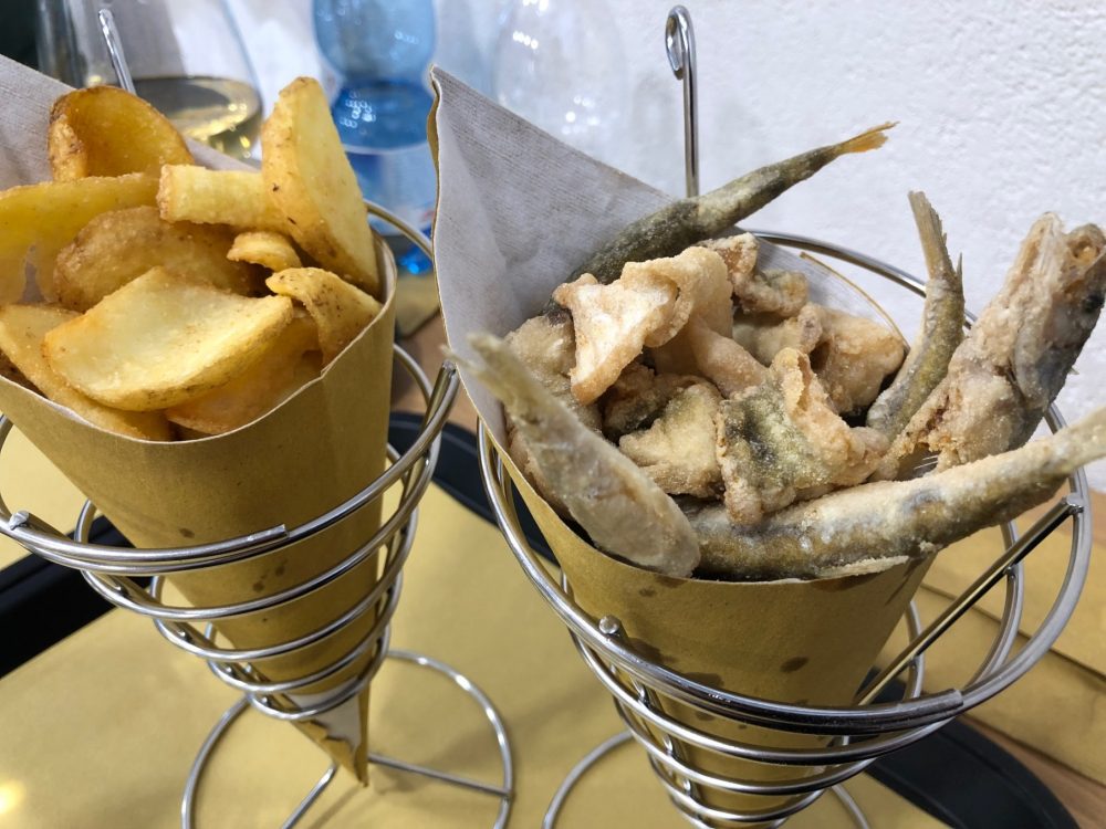 Proprio in quel ramo del lago di Como che volge a mezzogiorno è altamente consigliato presentarsi a mezzogiorno, sia la piccola saletta che il dehors di questo locale di Pescarenico sono letteralmente presi d’assalto, senza baionetta, bastano le mani (precedentemente lavate nell’ampio è pulitissimo bagno) per godere appieno di questi cartocci di pesce e patatine.
