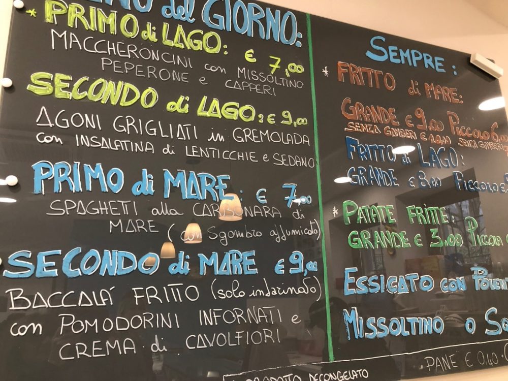 Da Ceko il pescatore, la lavagna con i prezzi correttamente esposti di lavarelli, persici, cavedani, fritto misto lacustre, fritto di mare e gli imperdibili missoltini