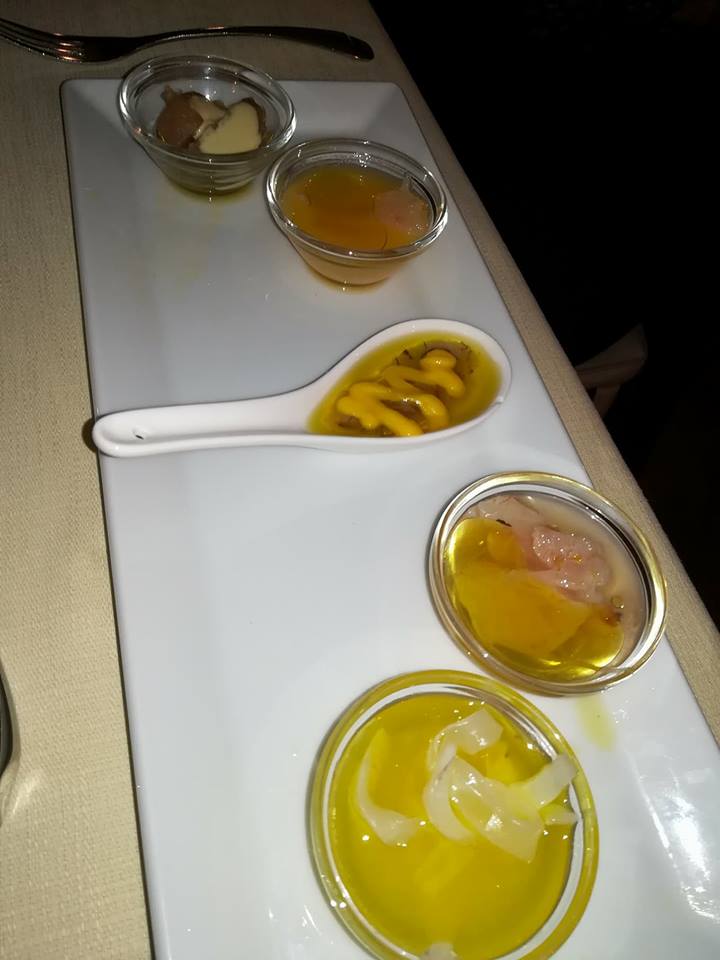 Arriva poi il pane fatto in casa, un grazioso cestino con piccoli panini: c’è quello integrale, ai cinque cereali, il bianco, ai pomodori secchi e quello con pancetta e rosmarino. A completarlo, i grissini tirati a mano.